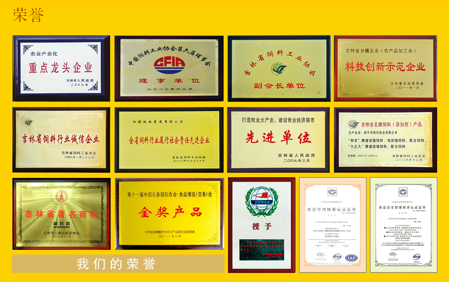 集團先后被評為吉林省農業(yè)產業(yè)化重點龍頭企業(yè)、牧業(yè)生產先進企業(yè)、吉林省飼料行業(yè)誠信企業(yè)、吉林省科技創(chuàng)新示范企業(yè)、吉林省科技創(chuàng)新先進企業(yè)、吉林省飼料協(xié)會會長單位、中國飼料工業(yè)協(xié)會理事單位,“和農”品牌榮獲“吉林省名牌飼料產品”與“吉林名牌”稱號、吉林省著名商標。創(chuàng)業(yè)先后通過了“ISO9001:2008質量管理認證”和“HACCP食品安全認證和農乳豬奶料、保育豬配合飼料、蛋王飼料連年榮獲中國農業(yè)食品博覽會金獎。
